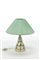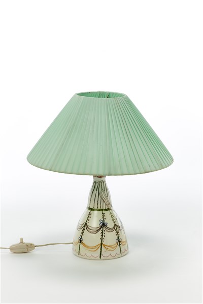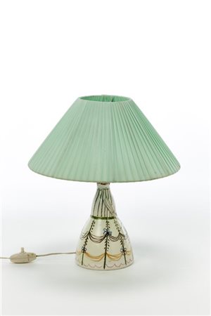 Piccola abat-jour in ceramica formata a colaggio in policromia sotto vetrina con figura femminile, paralume plissettato color verde acqua. Siglato e marcato sotto la base. (h cm 32) (lievi difetti)