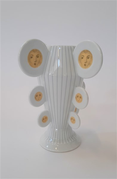 Vasetto in ceramica smaltata bianca decorato con medaglioni raffiguranti volti modello "Vasooro". Manifattura Eschenbach, Germania, anni '70/'80. (h cm 20)