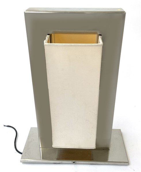 Lampada da tavolo a quattro luci in ottone cromato con paralume parallelepipedo