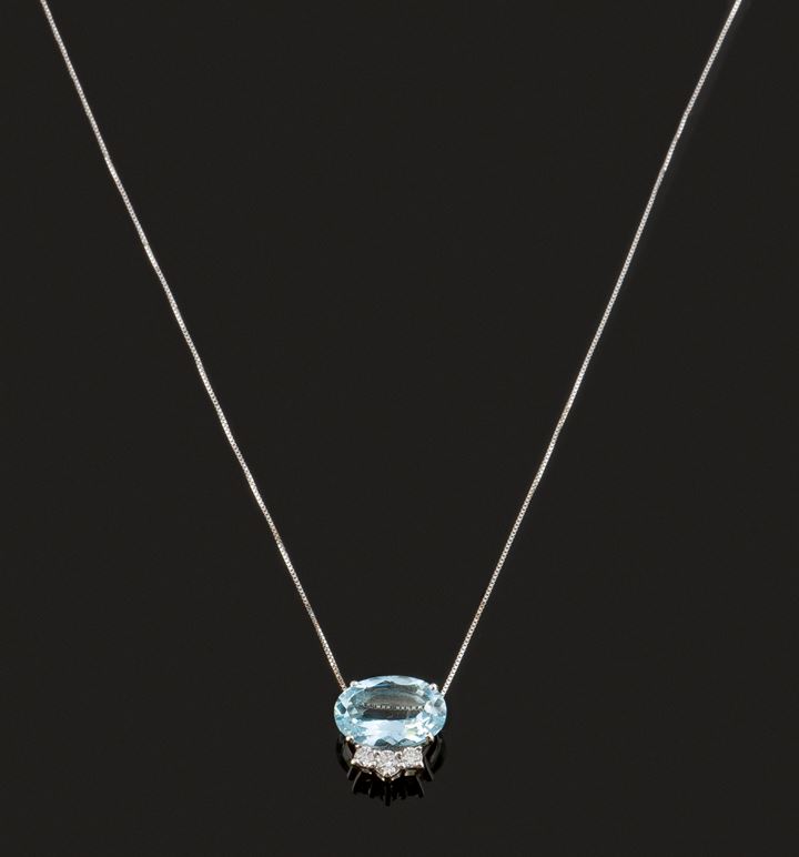 Catena con ciondolo in oro bianco con acquamarina taglio ovale sormontata da tre diamanti taglio
