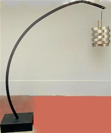 Lampada ad arco ready-made con paralume in metallo cromato a cerchi, struttura in metallo verniciato nero. Italia, secolo XX. (h cm 204) (difetti)