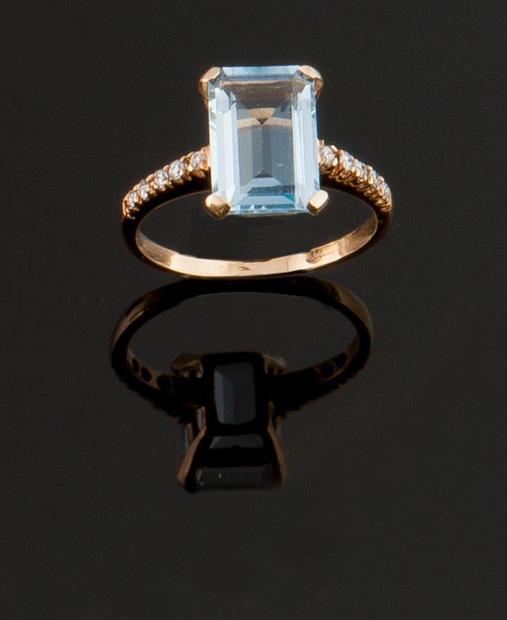 Anello oro giallo con al centro acquamarina taglio rettangolare; lungo il gambo diamantini taglio
