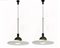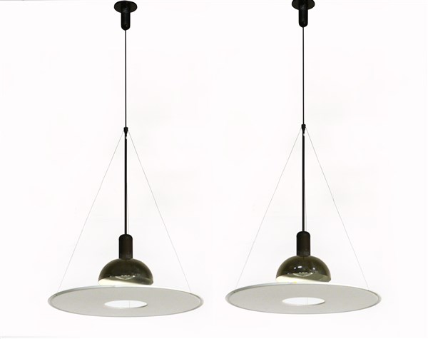 Coppia di lampade da sospensione modello "Frisbie". Produzione Flos, Milano, 1978. Polimetilmetacrilato opalino e metallo cromato. (h cm 112) (lievi difetti)