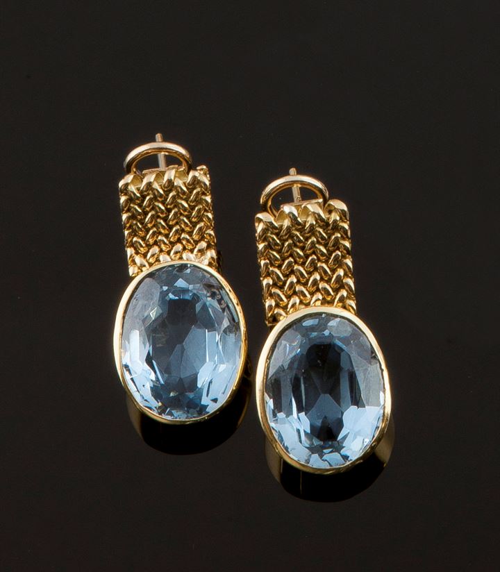 Coppia di orecchini pendenti in oro giallo, lavorati a maglia con due topazi di taglio ovale