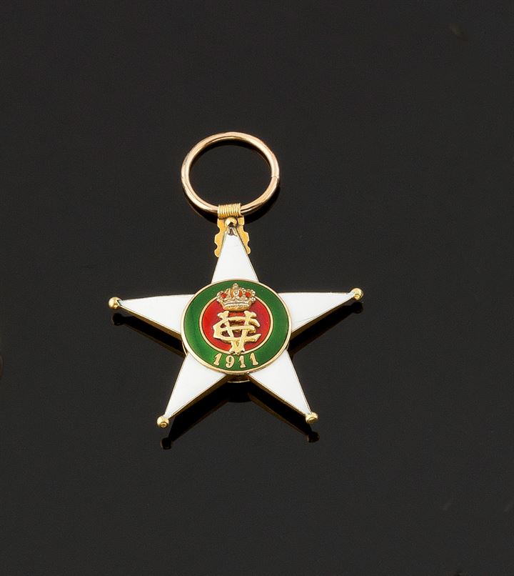 Decorazione militare in oro giallo e smalti policromi reca la scritta "Al merito coloniale-1911"