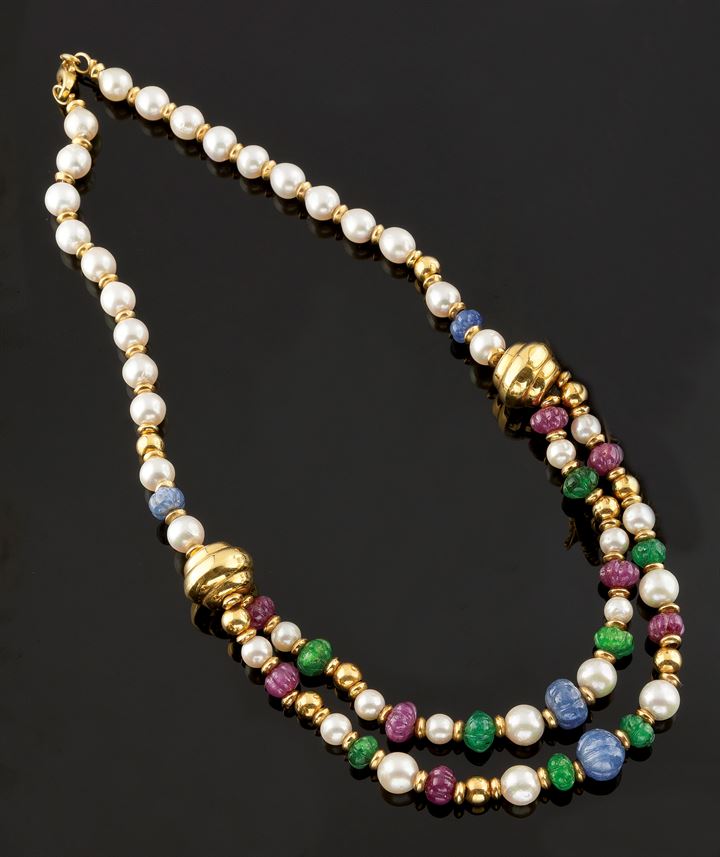 alternate a dischi, sfere in oro giallo e boules di rubini, zaffiri e smeraldi. Distanziali e chiusura in oro giallo