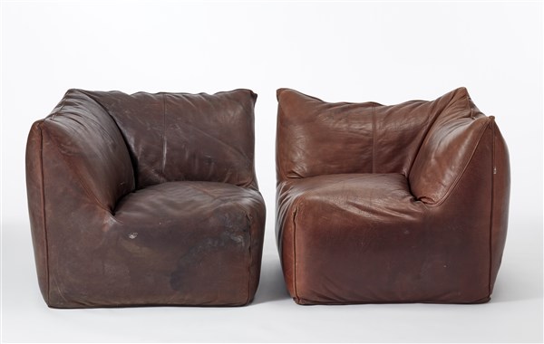 Divano composto da due elementi angolari divisibili della serie "Le Bambole". Produzione B&B, Italia, 1972. Rivestimento in pelle marrone. Premio "Compasso d'oro", 1979. (singolo elemento cm 80x72x80) (difetti)