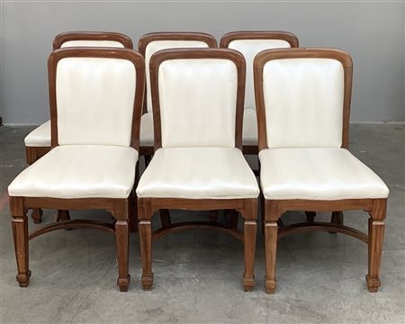 Sei sedie in noce massello con seduta e schienale imbottiti e rivestiti in similpelle bianca. Italia, anni '30/'40. (cm 53x100x60) (lievi difetti e restauri)