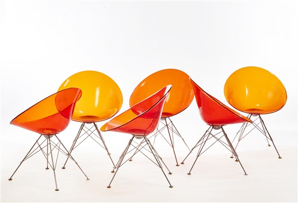 Lotto di sei sedie modello "Ero/s/". Produzione Kartell, Milano, anni '90. Struttura in acciaio cromato, seduta in policarbonato trasparente arancione. Marcate sulla struttura. (cm 62x81,5x63) (lievi difetti e piccole mancanze)