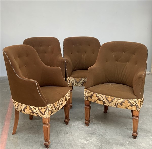 Quattro poltrone in noce massello, rivestite in panno marrone con fascia inferiore in tessuto damascato. Italia, anni '30/'40. (cm 64x98x70) (lievi difetti e piccole mancanze)