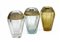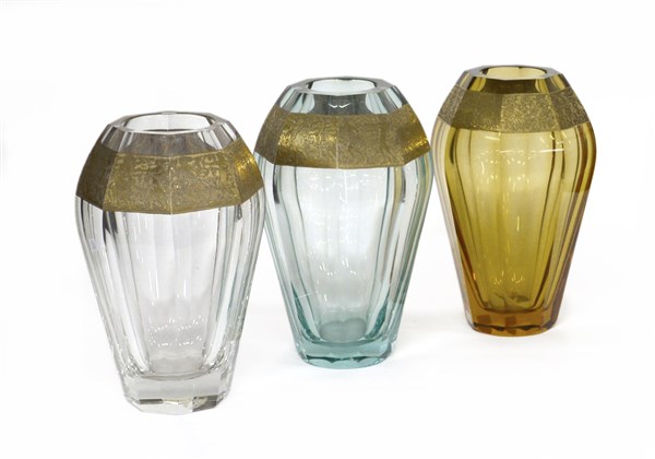 Lotto di tre vasi sezione esagonale in cristallo di Boemia incolore, azzurrino e ambrato con fregio in oro decorato con scene classicheggianti. Cecoslovacchia, secolo XX. Firmato sotto la base. (h cm 27) (lievi difetti)