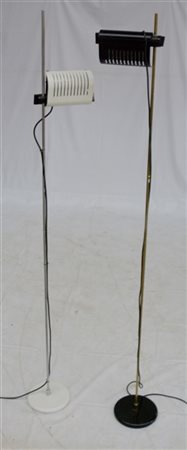 Lotto composto da due lampade da terra modello "626". Produzione O-Luce, Milano, anni '70. Base e paralume in metallo laccato bianco e struttura in metallo cromato, base e paralume in metallo laccato nero e struttura in metallo color oro. (h cm 204) (difetti)