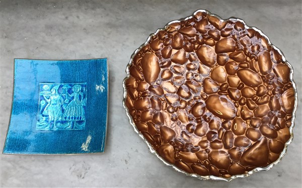 Lotto composto da un piatto in rame smaltato azzurro, decorato con due figure, firmato Del Campo sotto la base unito a un ceramica smaltata sotto vetrina color bronzo e argentato. (misure diverse) (lievi difetti)