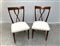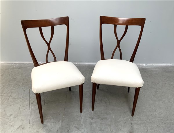 Coppia di sedie con struttura in legno di mogano, schienale a giorno, seduta imbottita e rivestita in similpelle bianca. Italia, anni '50. (cm 48x87x50) (lievi difetti e restauri)