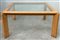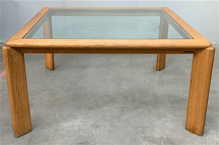 Tavolo quadrato con struttura in legno di rovere massello con piano in cristallo molato. Italia, anni '70. (cm 142x74x142) (gravi difetti)