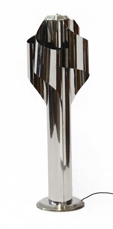 Lampada da terra a quattro luci con struttura in lamiera di acciaio inox calandrata di forma spiraliforme. Anni '70/'80. (h cm 110) (lievi difetti e mancanze)
