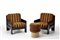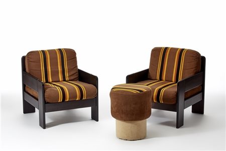 Lotto composto da due poltrone e un pouf con struttura in legno massello e cuscini imbottiti rivestitI in velluto a coste nei toni del marrone e arancione. Italia, anni '70. (poltrone cm 63x72x70; pouf h cm 50, d cm 40) (lievi difetti)