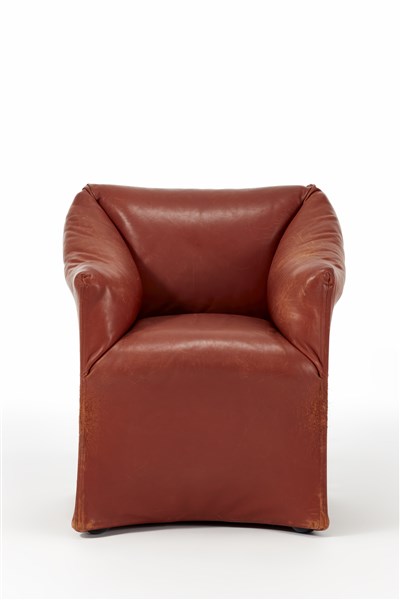 Poltroncina modello "684 Piccola tentazione". Produzione Cassina, Meda, disegno del 1973, esemplare del 1980. Struttura in tenditori di nylon e legno, sedile in poliuretano espanso, imbottitura in piuma, rivestimento in pelle marrone. (cm 75x85x60) (gravi difetti)