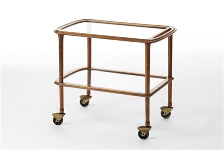 Carrello portavivande con struttura in legno massello e due ripiani in vetro. Italia, anni '40/'50. (cm 75x62x46) (lievi difetti e piccole mancanze)