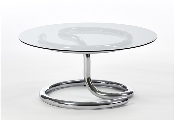 Tavolino modello "Anaconda". Produzione Strassle, Svizzera, anni '70. Piano circolare in vetro fumé, struttura in acciaio cromato. (h cm 38; d cm 80) (difetti)