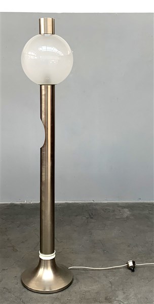 Lampada da terra modello "Melissa". Produzione Esperia, Poggibonsi, anni '70. Alluminio spazzolato, alluminio smaltato, vetro opalino. (h cm 178) (lievi difetti e mancanze)