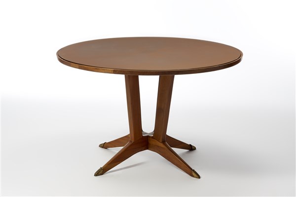 Tavolo con piano circolare in legno massello con puntali in ottone e sovrappiano in vetro retroverniciato. Italia, anni '40/'50. (h cm 76,5; d cm 121,5) (lievi difetti)