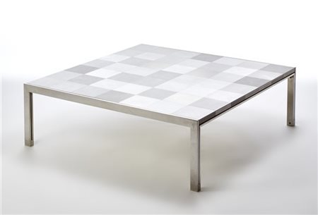 Tavolino da salotto della serie "Luar". Produzione ICF, Italia, anni '70. Acciaio cromato, piano in legno rivestito da lastre in metallo satinate. (cm 136x42x133) (lievi difetti)