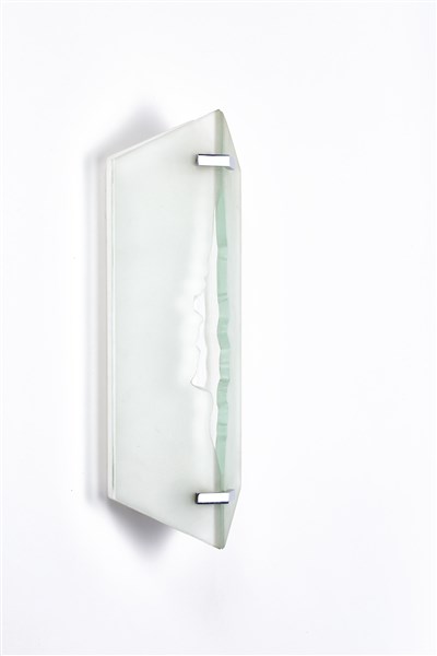 Lampada da parete. Produzione Fontana Arte, Milano, anni '60. Doppio paralume in cristallo di forte spessore molato e satinato e metacrilato opalino, struttura in metallo verniciato bianco, fermavetri in metallo cromato. (l cm 46) (lievi difetti)