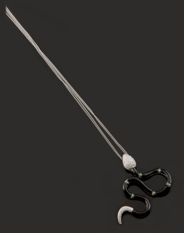 Catena con ciondolo in oro bianco raffigurante un serpente recante corpo in onice,