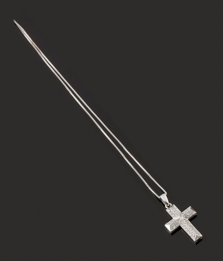 CATENA CON CIONDOLO Catena in oro bianco con ciondolo a forma di croce...
