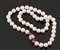 Collana composta da un filo di perle giapponesi dal diam di mm 7,8 a 8,1; chiusura in oro bianco, a barilotto, con corallo rosso, onice e piccoli diamanti taglio brillante