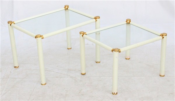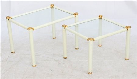 Lotto composto da due tavolini a nido con struttura in metallo verniciato bianco e ottone, piani in vetro. Italia, secolo XX. (tavolino grande cm 55x37x40; tavolino piccolo cm 46x32x40) (lievi difetti)