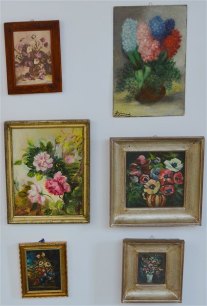 Lotto di sette dipinti e riproduzioni raffiguranti fiori, misure diverse. Sei in cornici (difetti)