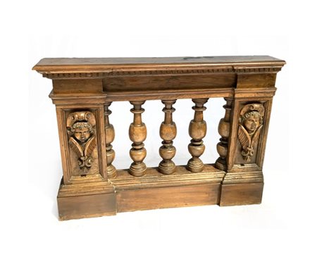 Parte di balaustra in noce decorata con colonne tornite e fregi laterali a volu