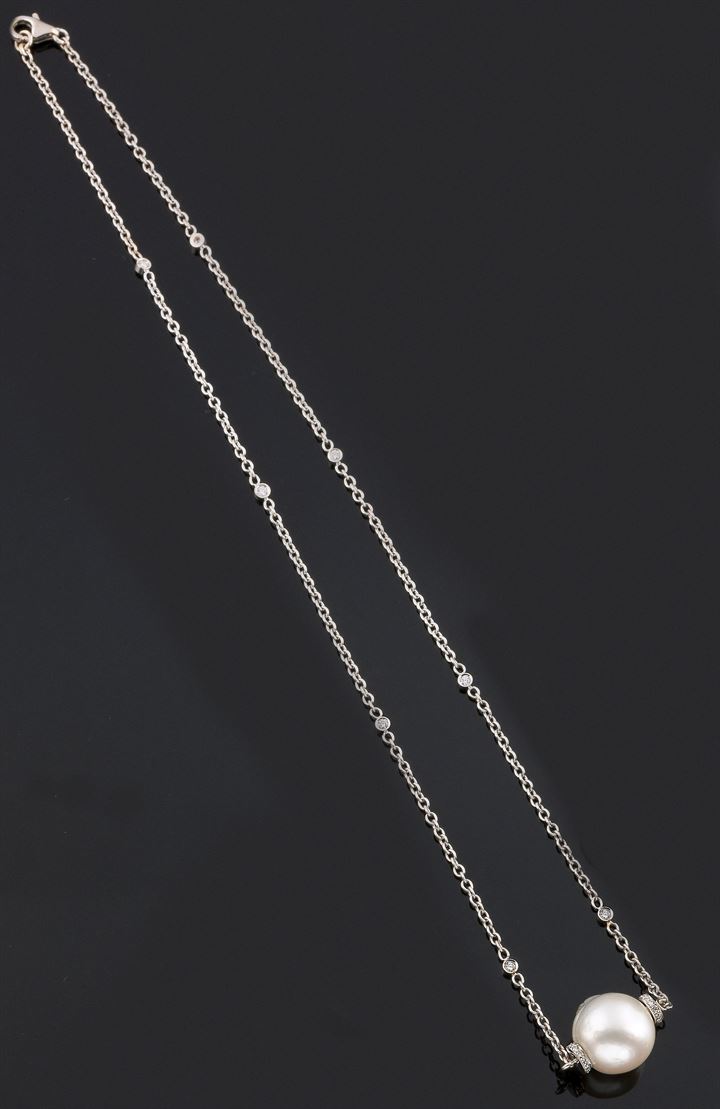 Collana in oro bianco con diamanti taglio brillante per complessivi ct 0,25 ca; al centro perla australiana del diam di mm 12,7