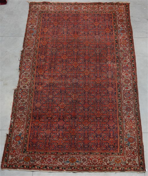 Decoro Herati nei toni del rosso, arancio e bianco su fondo blu. Bordure Herati su fondo bianco. (cm 390x210) (Difetti, vecchi restauri e mancanze)