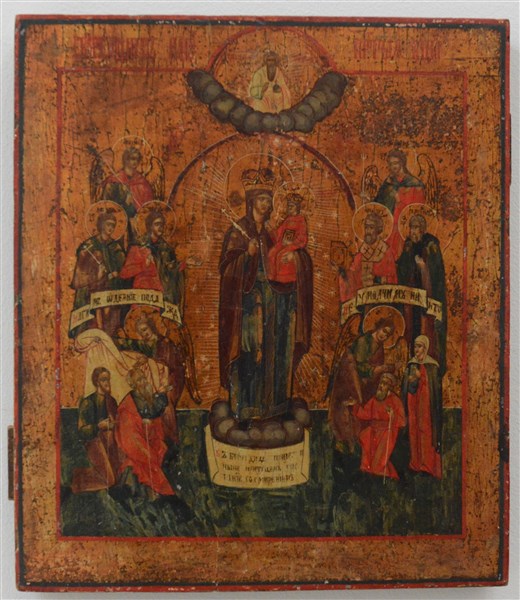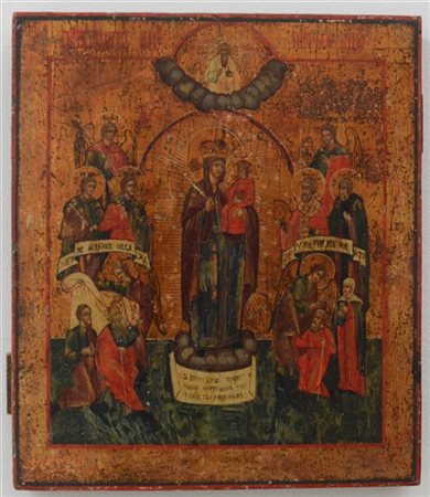 Icona ad olio su tavola a fondo oro raffigurante Madonna con Santi, inscrizioni in cirillico (cm 35,5x31) Russia, secolo XIX (restauri)