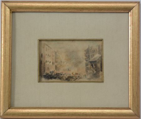 Ignoto del XIX Secolo "Le barricate" acquerello su carta (cm 6x9) In cornice (