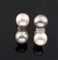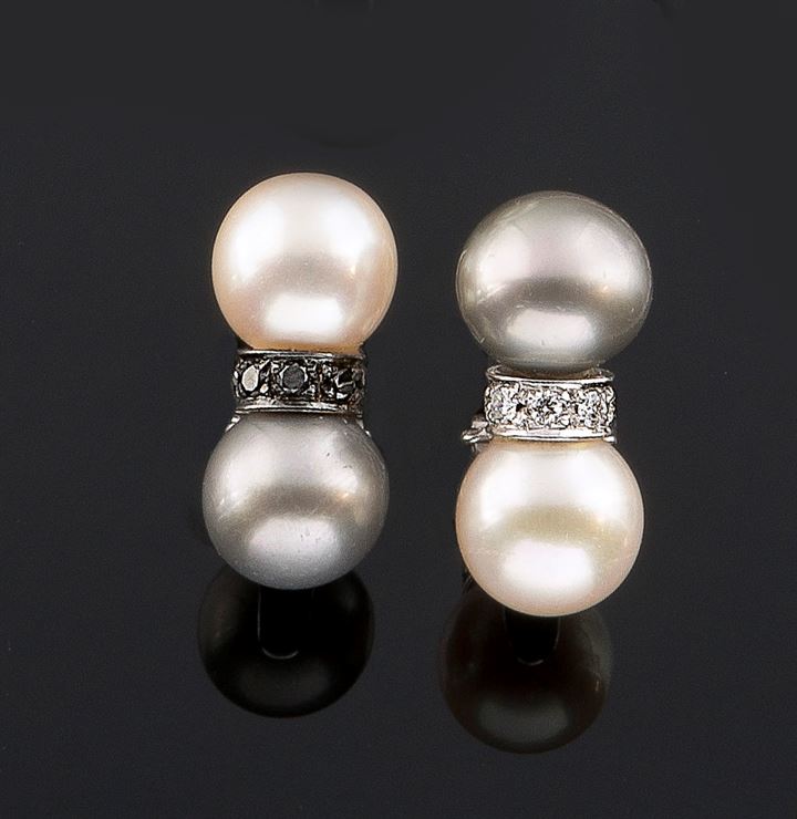 Coppia di orecchini in oro bianco composti da quattro perle di acqua dolce di cui due di colore grigio e due di colore bianco, rispettivamente alternate e raccordate da un anello con diamanti taglio brillante di colore bianco e di colore nero per complessivi ct 0,25 ca