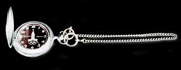 Orologio da tasca russo in acciaio, per le olimpiadi di Mosca del 1980. Movimento con carica remontoir, quadrante blu e indicazione dei piccoli secondi.