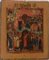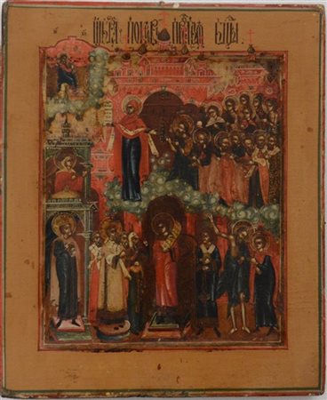Icona ad olio su tavola parzialmente dorata raffigurante la Protezione della Madre di Dio (cm 30,5x25,5) Russia, secolo XIX (difetti)