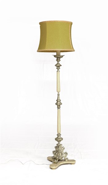 Candeliere tripode con fusto in metallo sbalzato e legno montato a luce elettrica (h cm 171) (difetti)
