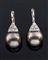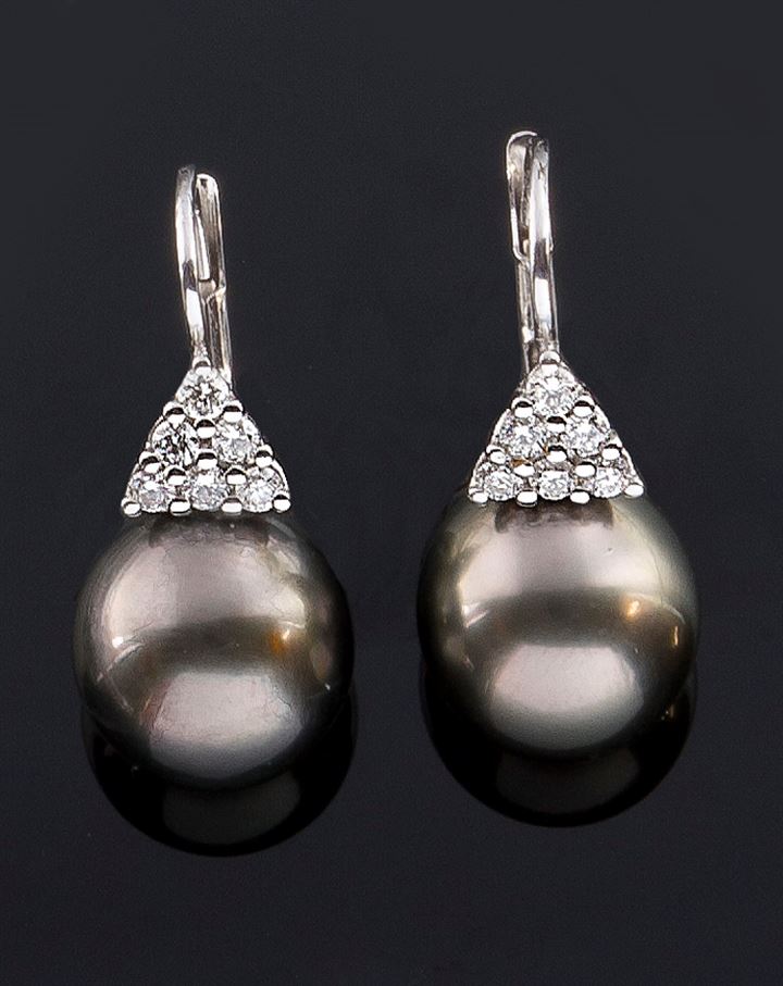 Coppia di orecchini in oro bianco, a monachella, con due perle Tahiti del diam di mm 11,8;
