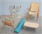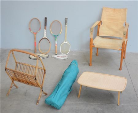 Lotto composto da un vassoio da letto, quattro racchette da tennis anni 70, un portariviste e due sedie da campeggio (difetti)