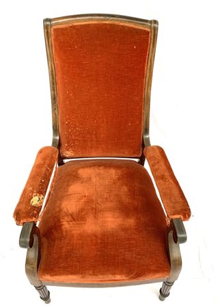 Poltrona con braccioli e schienale filettato in legno chiaro, gambe anteriori tornite e scanalate. Secolo XIX (difetti)