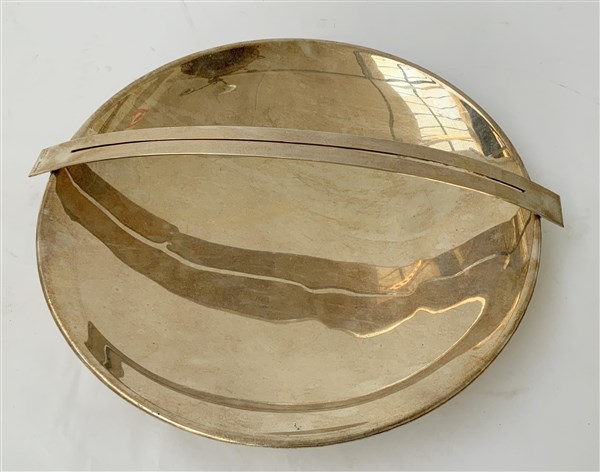 Centrotavola in metallo argentato con ansa centrale. Firmato sull'ansa. (d cm 45) (lievi difetti)