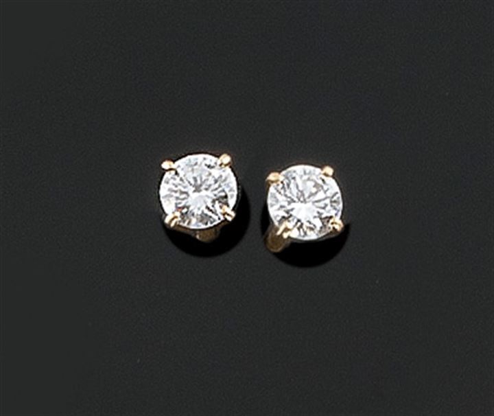 Coppia di orecchini in oro giallo, a lobo, firmati "Musy", con due diamanti taglio brillante di ct 0,30 ca