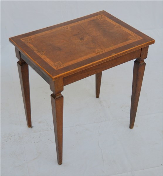 Tavolino da salotto con gambe rastremate e piano decorato con piccoli intarsi (cm 54x53x38)