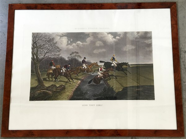 Litografia inglese a colori del secolo XIX raffigurante "Mc Queen's steeple chasing" (cm 76x100 il folio) in cornice (difetti)