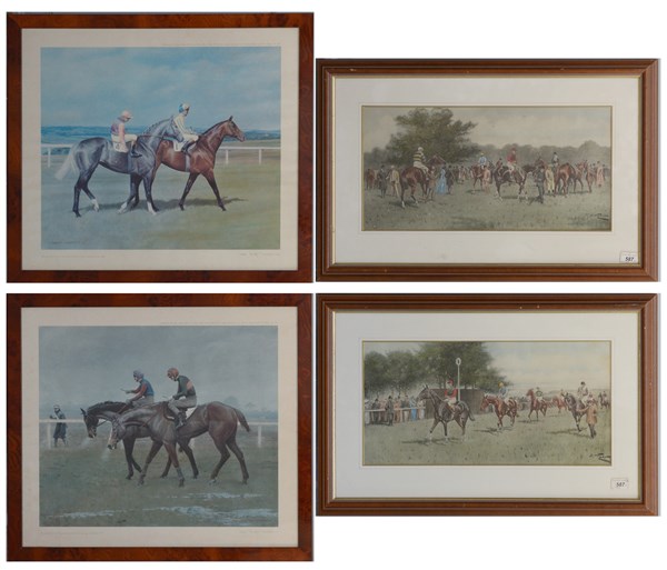 Lotto di due coppie di stampe a colori inerenti le corse a cavallo, misure dver